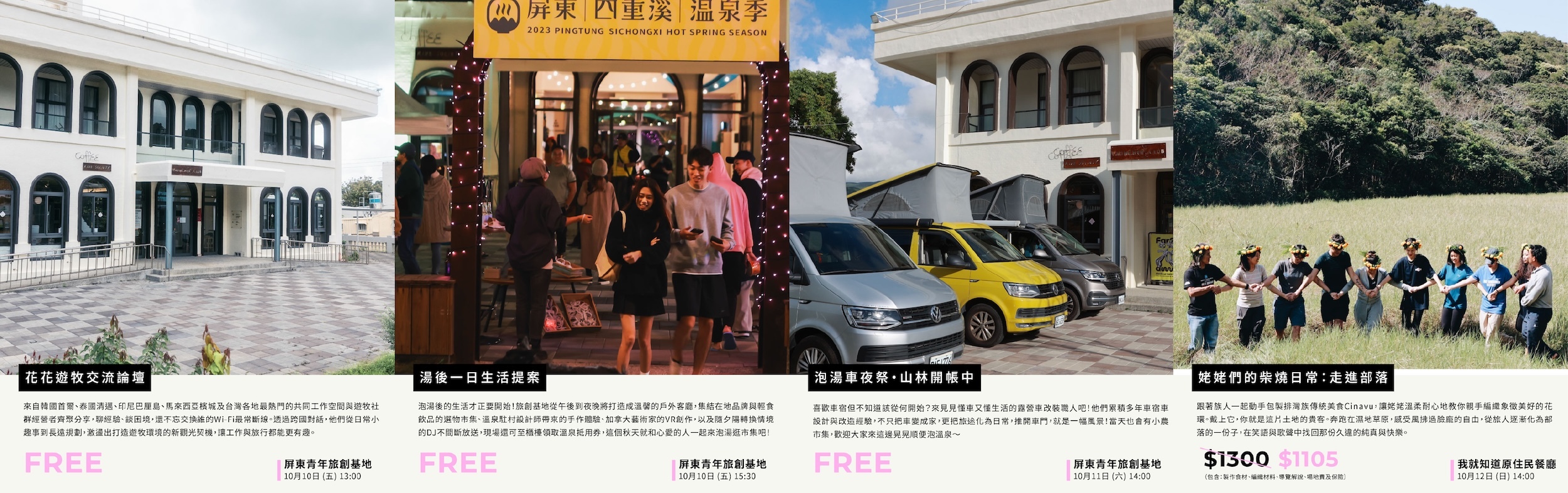 探索跨國遊牧經驗、泡湯後逛市集、參與設計師工作坊與電子湯氣演出;走進車宿生活,親手包 Cinavu、編花環,奔跑濕地草原,沉浸在移動生活的自在節奏。